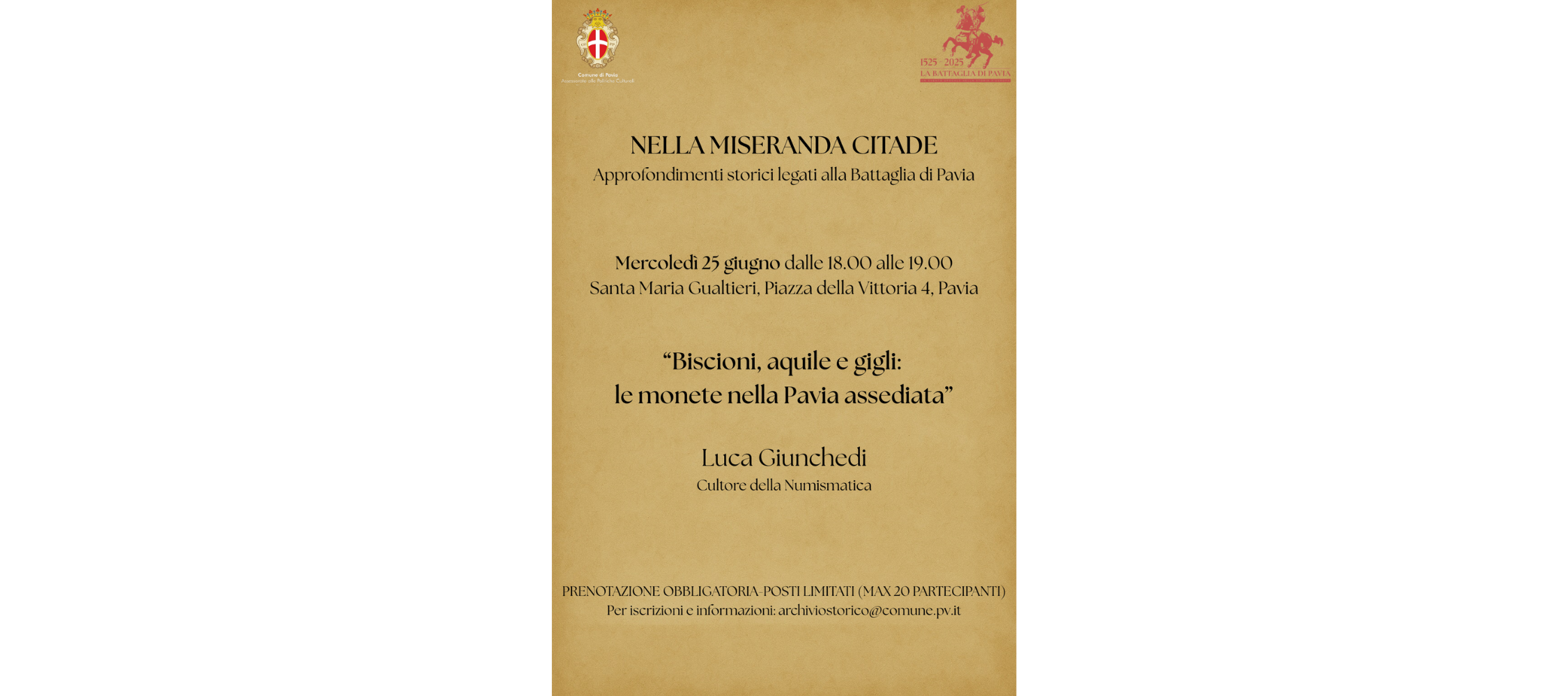 Mercoledì 25 Giugno dalle 18:00 alle 19:00 Santa Maria Gualtieri, Piazza della Vittoria 4, Pavia Ospite: Luca Giunchedi – Cultore della Numismatica Prenotazione obbligatoria – Posti limitati (MAX. 20 partecipanti) Per iscrizioni e informazioni: archiviostorico@comune.pv.it