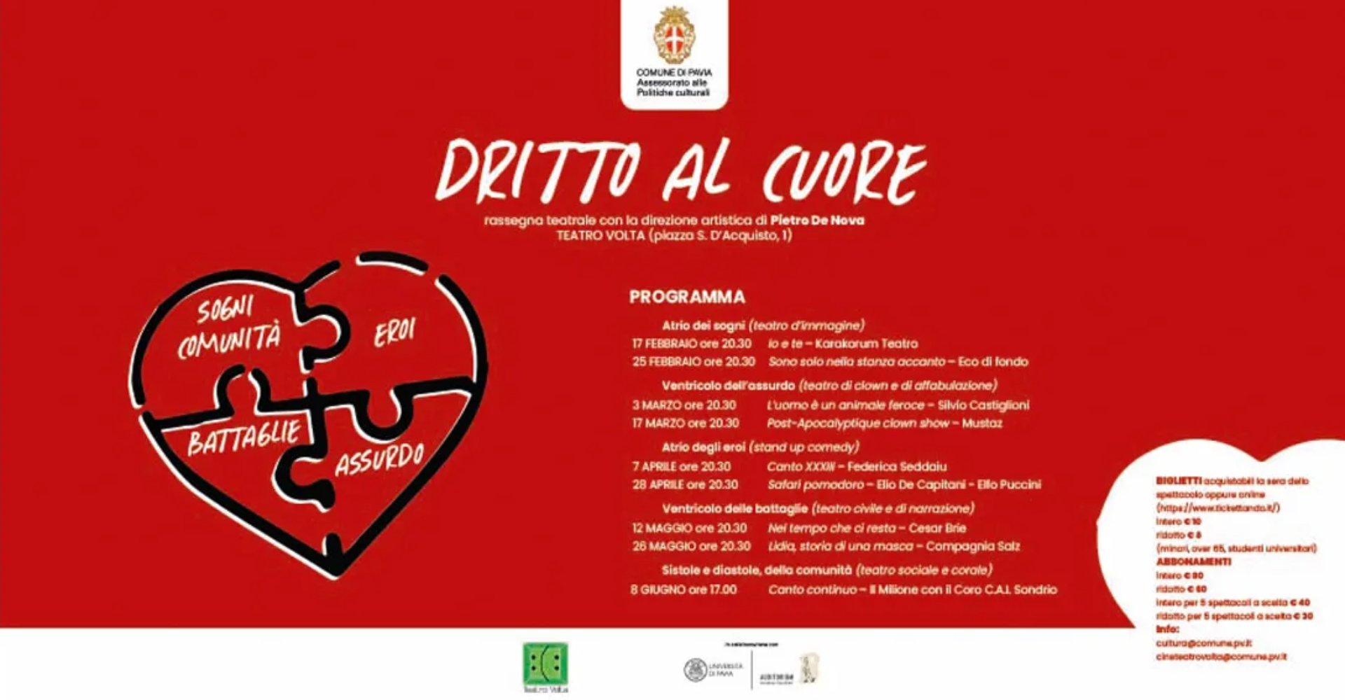 L’assessorato alle Politiche culturali del Comune di Pavia organizza la rassegna teatrale “Dritto al cuore”, con la direzione artistica di Pietro De Nova e la collaborazione del Dipartimento di Studi Umanistici dell’Università di Pavia.