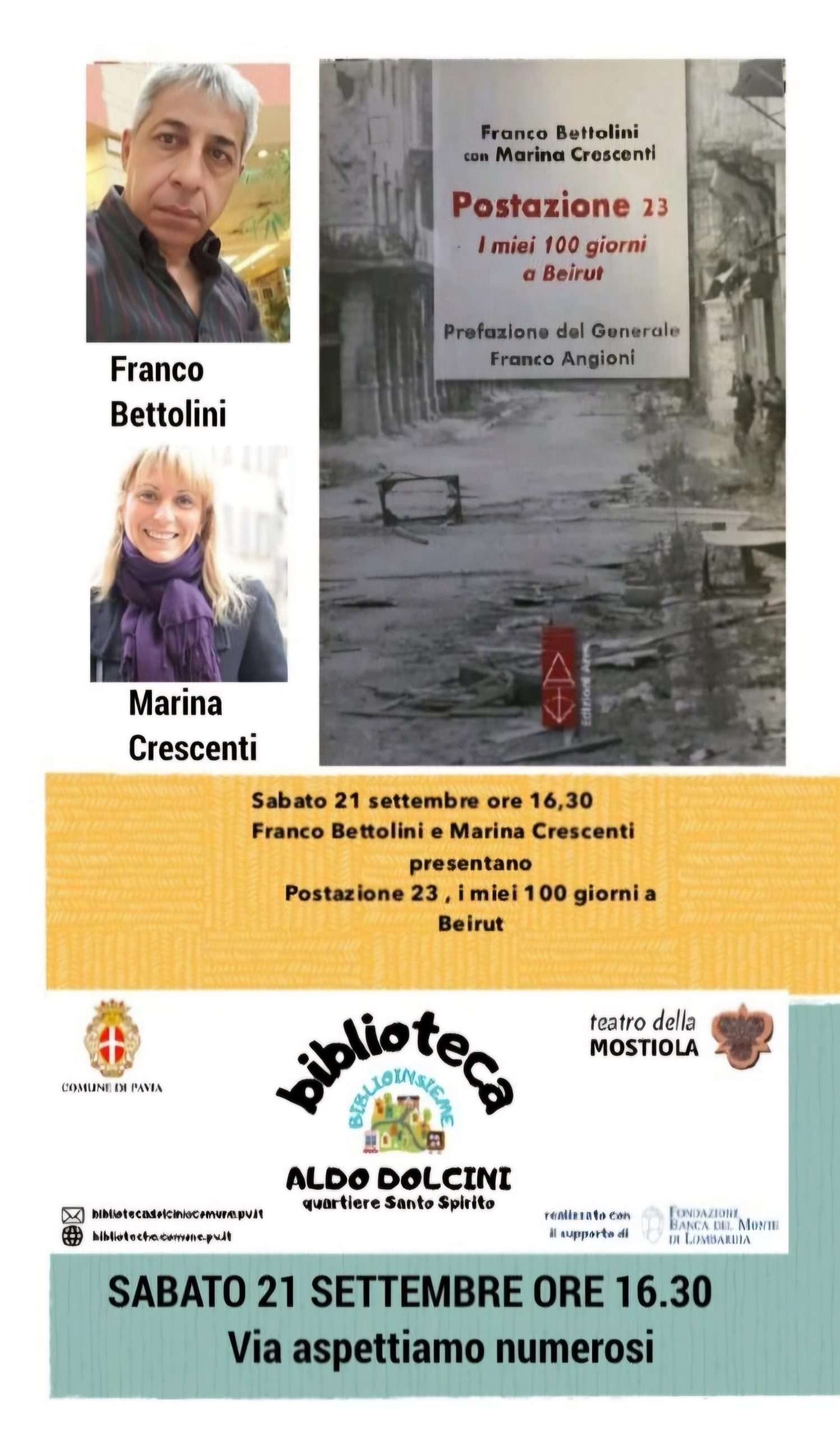 Sabato 21 settembre ore 16:30, Franco Bettolini e Maria Crescenti presentano “Postazione 23”, i miei 100 giorni a Beirut.