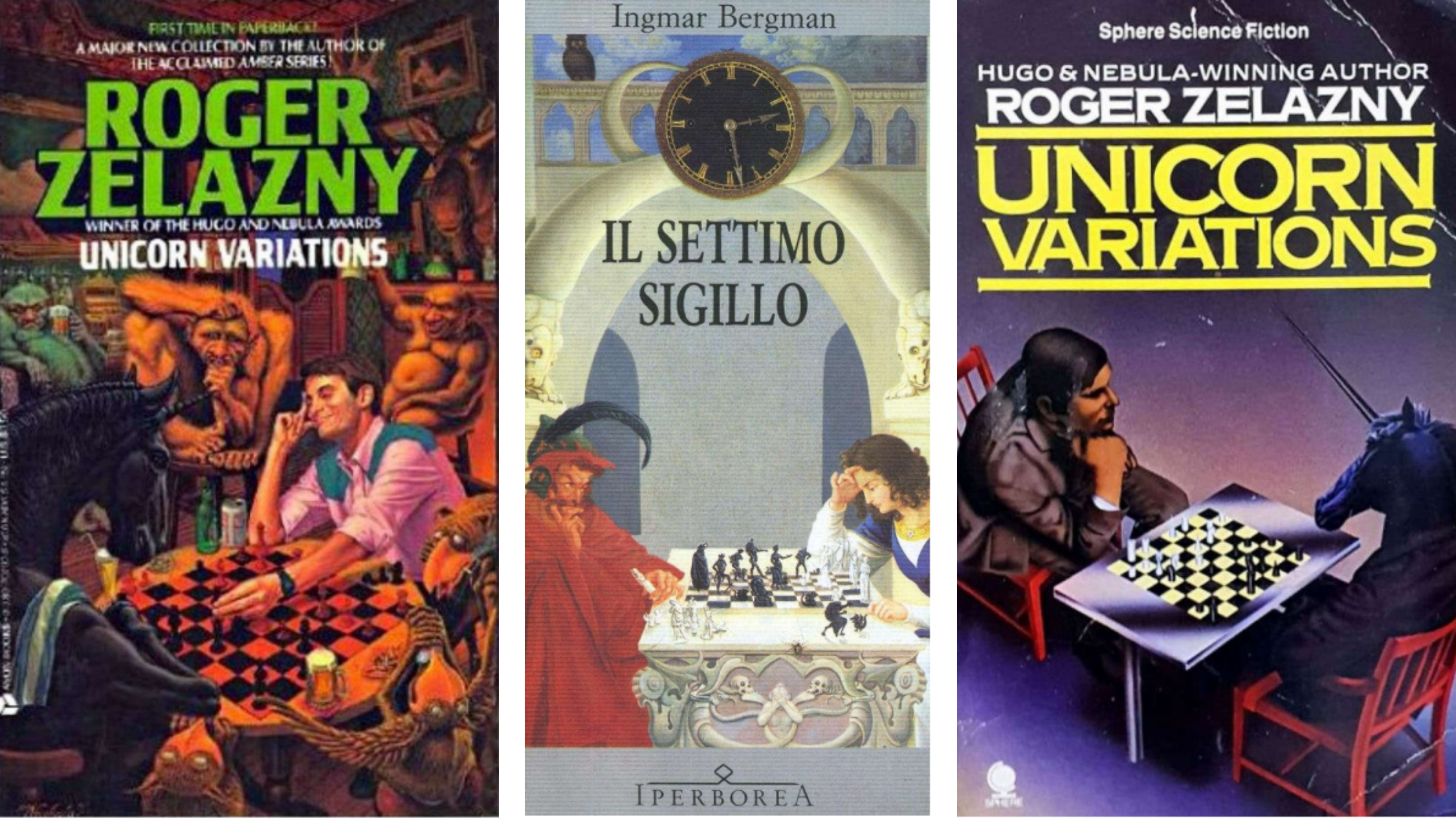La seconda storia appartiene a Roger Zelazny (professore di letteratura, esperto di mitologia e cultura orientale, ma anche judoka e giocatore di scacchi). In “La variante dell’Unicorno” (Unicorn variation, 1981 – premio Hugo ) il protagonista si trova in una situazione non diversa da quella di Albert Moreland o del cavaliere Block. Martin è un ex scacchista, che ha rinunciato al gioco ed è diventato un vagabondo: viene trascinato in una dimensione parallela, in cui si trova a giocare contro un unicorno una partita a scacchi, che ha come posta la permanenza della razza umana quale specie dominante della Terra. Nella visione di Zelazny, ogni volta che una specie animale si estingue (in genere per colpa degli umani), si apre lo spazio per la ricomparsa nel mondo di una specie fantastica. L’unicorno che appare è, ovviamente, di colore nero. Intanto, intorno ai due giocatori si sono riunite tutte le creature dell’immaginario gotico e fantastico, che tifano per la sconfitta dell’umanità, onde poter ritornare i padroni del mondo. Per questo racconto, Zelazny ha riferito a Gian Filippo Pizzo di essersi servito come modello di una vera partita: Halprin-Pilsbury, Monaco 1900.
